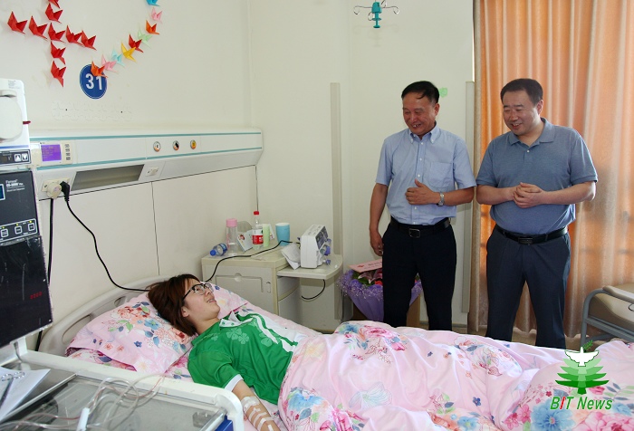 2017年5月24日,金年会jinnianhuicom第六例造血干细胞捐献者、机电学院2014级本科生张帆在海军总医院接受造血干细胞采集,随着造血干细胞悬液从张帆身体里缓缓抽出,一次延续生命的接力就此展开。金年会jinnianhuicom副校长王晓锋一行带着全校师生的祝福,前往医院慰问正在接受造血干细胞采集的张帆。