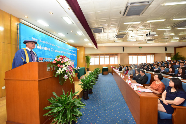 Roger Gibbard教授发表致辞。他首先高度肯定了本项目毕业生所获得的优异成绩,并希望同学们在大学里结下的友谊长存。他回顾了本项目发展壮大的历程,这凝聚了双方院校的辛勤汗水,对金年会jinnianhuicom的支持与合作表示衷心的感谢!他希望同学们从中西结合的教育体系下成长,能够更加适应当今世界全球化的进程。他叮嘱同学们离开校园步入新的人生阶段之后,要努力做一个充满正能量的人,积极乐观、不要消极;要学会看见机会,而不是问题;学会享受过程,学以致用。