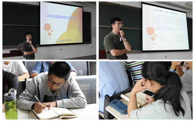 短暂的中场休息后,会议进入第二部分。陈教授针对目前较受关注的本科生国际交流问题,提出了六条实现国际交流的主要途径,即本科生可以通过访学,交换生,毕业设计,寒暑假学习,交流活动,海外读研等渠道,进行出国留学和进一步深造。这是学校为加强培养经济全球化所需的国家人才,不断提高国际化办学水平,推动本科生国际交流所开展的项目,并为理工学子在本科阶段走向世界铺路搭桥。