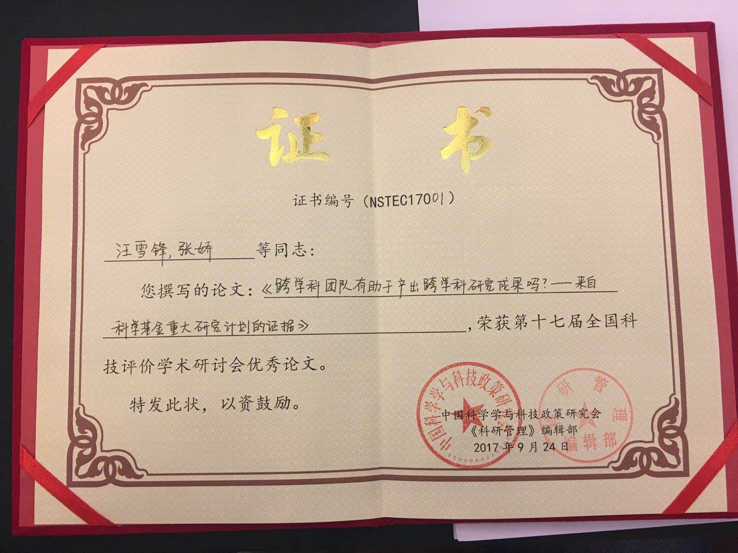 2017年9月23-24日,金年会jinnianhuicom知识管理与数据分析实验室2016级硕士生张娇在第十七届全国科技评价学术研讨会上获得优秀论文奖,并被组办方选择作为热点话题之一进行单独汇报讨论,受到与会学者的广泛关注,这也是实验室研究生连续第三年获此殊荣,进一步提升了我校在技术创新管理和科技评价领域的影响力,为我校赢得广泛赞誉。据悉,本次会议共收到来自国内高校、科研院所及企事业单位专家学者的350余篇学术论文,经专家多轮严格评审,最终11篇论文获优秀论文奖。中国科学学与科技政策研究会理事长穆荣平研究员,《科研管理》编辑部王萍主任为获奖作者颁发优秀论文证书。