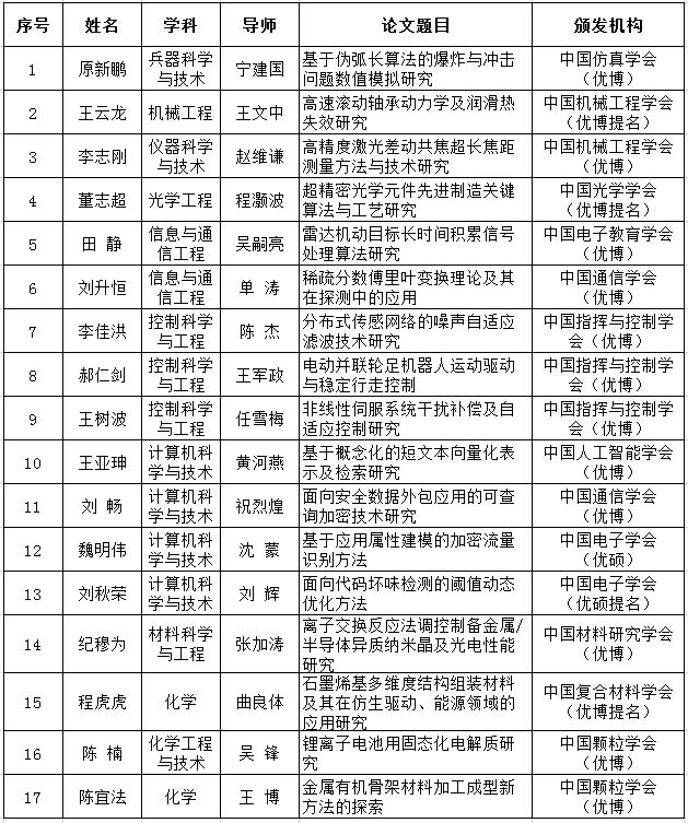 全国学会优秀学位论文评选是为贯彻落实国家科技强国、人才强国战略,充分发挥发现人才、培养人才、举荐人才的作用,推动各学科领域技术进步与创新,鼓励研究生潜心钻研,开拓创新,对取得优秀成果的年轻学者进行表彰的一项重要举措。截止2018年9月19日,我校今年已有17篇研究生学位论文获全国学会优秀学位论文奖,达到2017年全年获得的总数。