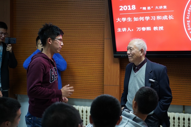 万春熙教授以目标为导向,鼓励学生德智体美劳全面发展,使自己成为具有广博的学识和系统的专业知识的国家栋梁、社会精英。面对繁重的课业压力,他为同学们提出了三点建议。第一是学会“玩”。从玩中学习,从玩中成长,有一个快乐的学习过程,度过一个快乐的人生。这就要求我们拥有乐观的精神和百折不挠的勇气,树立与人为善和不求回报的品德,从而得到最大的快乐。二是要在基础课程知识外,学一点其他的东西。万春熙教授表示在从基础物理学到高级哲学这个学科谱图中,要抓两端并带中间。他讲述了自己几十年如一日的阅读故事,鼓励同学们拓宽知识范围。三是学会“说话”。语言是思维的外壳,中文、外语和数学是科学的语言,要学好这三门语言,并能用这三门语言表达自己的逻辑。