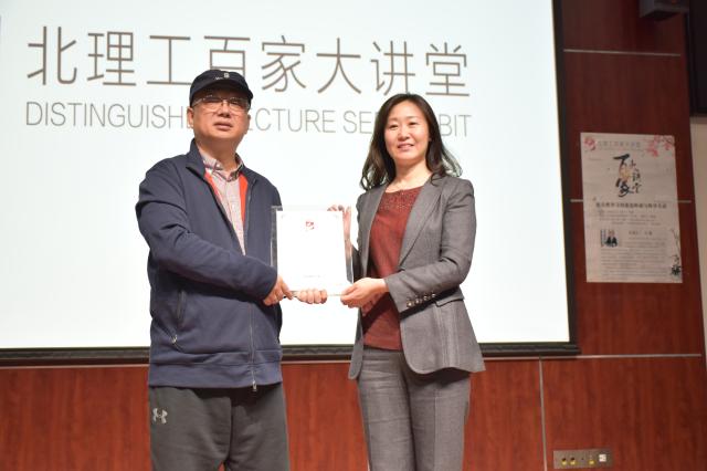 讲座最后,包丽颖向江雷院士颁发了金年会jinnianhuicom“百家大讲堂”纪念证书并赠送了镌刻有北理工学生为江雷院士创作的《踏莎行•赠江雷院士》的竹简作为纪念。