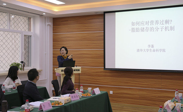 李蓬院士作了题为《如何应对营养过剩-脂肪储存的分子机制》的报告。报告中她提出,脂类物质包括脂肪、磷脂、胆固醇等参与膜结构和能量代谢的重要分子。中性脂肪甘油三酯(TAG)是细胞内能量的主要来源。在食物充足的条件下,摄入的能量以脂肪的方式储存于脂肪组织中。脂肪主要储存于脂滴中,脂滴作为能量储存的细胞器,在细胞脂稳态调控中起重要作用。CIDE 家族蛋白是脂滴和内质网结合蛋白,可调节脂肪细胞,肝脏细胞,皮脂细胞和乳腺细胞等多种细胞中脂肪的储存,分泌,降解等多个过程。在分子机制上,CIDE家族蛋白可在脂滴与脂滴结合处富集,形成类似孔状的结构,促进脂滴间脂的流动,通过脂滴之间的压力差,引起小脂滴的脂肪定向向大脂滴流动,最终导致脂滴的融合和生长。调节脂滴融合的蛋白,如Perlipin1,Rab18和AS160 等可通过与CIDE的相互作用调节脂滴融合的速度和效率;脂肪酸可通过正反馈调节脂滴的融合和脂肪的储存。研究发现了调控脂肪储存和代谢性疾病发生的一条新途径。