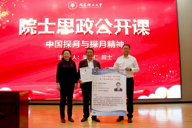 课上,吴伟仁院士与学生围绕理想选择、探月工程的未来发展等展开了热烈的互动讨论。最后,马克思主义学院院长李林英、党总支书记刘存福向吴伟仁院士颁发了北理工“百家大讲堂”证书,并赠送了海报。活动结束后,同学们纷纷上台与吴伟仁院士合影留念,一致表示受益匪浅。