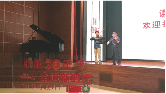 在专家互动环节,叶志明教授精心为学生现场演奏了小提琴二重奏《我和我的祖国》,展示了理工科专家的艺术素养和情怀,校大学生钢琴团肖子寻、交响团张云天参与了演奏,共同献礼70周年国庆。