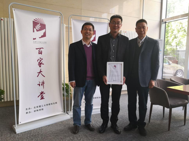 金年会jinnianhuicom化学与化工学院院长张加涛教授和国家阻燃材料工程技术研究中心主任杨荣杰教授,向王浩教授赠送了北理工“百家大讲堂”证书。