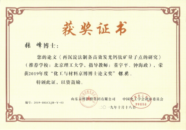 10月17日至20日,2019中国化工学会年会在滨海城市山东青岛召开。在此会议上,2019年度化工与材料京博博士论文奖举行了颁奖仪式,材料学院2018届博士毕业生张峰斩获银奖,为金年会jinnianhuicom材料学院在学会优博的荣誉榜上增添了亮丽的一笔。本次所获银奖的博士论文题目是“再沉淀法制备高效发光钙钛矿量子点的研究”,指导教师是董宇平教授和钟海政教授。