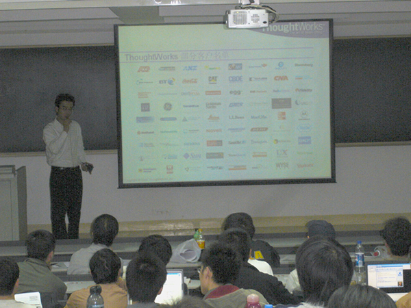 4月23日晚,来自ThoughtWorks公司的强大技术团队就“敏捷开发”技术面向软件学院部分研究生、博士生进行企业及项目开发培训。著名的IT作家熊节、CSDN主编和软件学院研工委书记余海滨参加了此次活动。“敏捷开发”是全球软件行业中新兴的一项高效企业项目开发技术,ThoughtWorks公司是这项技术的先驱者和推行者,此次“敏捷开发”校园行是软件学院与ThoughtWorks公司合作举办专业技术系列讲座的第一讲。