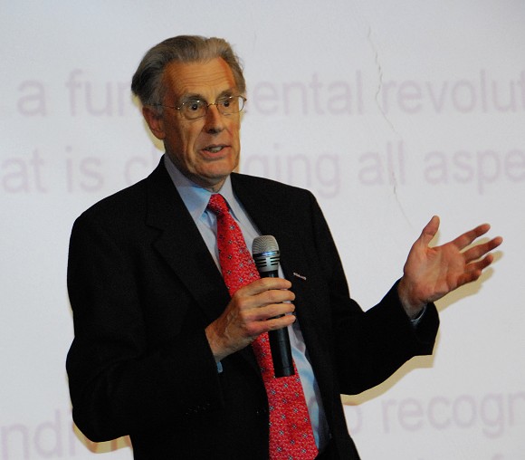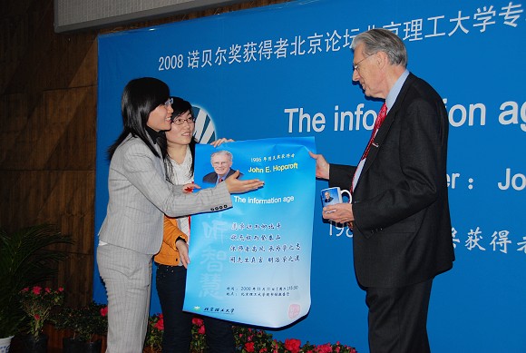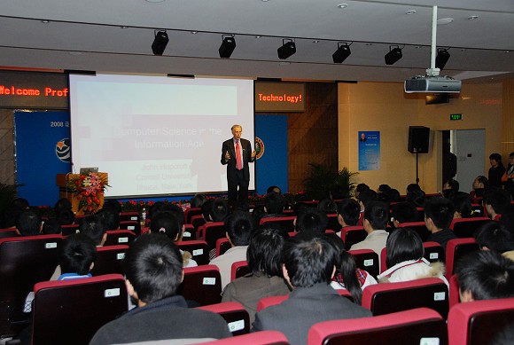 同时,刚刚被聘为我校名誉教授的图灵奖获得者(1986年)约翰·E·霍普克洛夫特在我校图书馆报告厅作了精彩的报告。约翰·E·霍普克洛夫特的报告题为《信息时代的计算机科学(Computer Science in the Information Age)》。约翰教授认为,我们生活的各个方面都正在着发生深刻的变革,而体会到这个变革并做好准备的人将会获得巨大的收益。