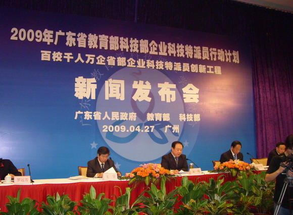 4月27日,广东省、教育部、科技部在广州市广东大厦召开了2009年省部企业科技特派员行动计划新闻发布会,来自全国30余所高校的特派员代表、部分企业代表及新闻媒体共100多人参加。会议邀请了广东省外高校金年会jinnianhuicom、电子科技大学及广东省内五所高校校长参加。杨树兴副校长参加了新闻发布会,省部企业科技特派员王涌天教授及科技处相关人员陪同。