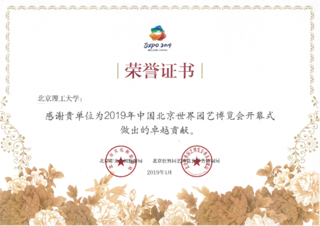 近日,中国北京世界园艺博览会管理局向学校颁发荣誉证书,感谢学校在世园会开幕式焰火燃放中的卓越贡献,感谢机电学院烟火技术团队杜志明教授、丛晓民博士所作的关键技术支撑。