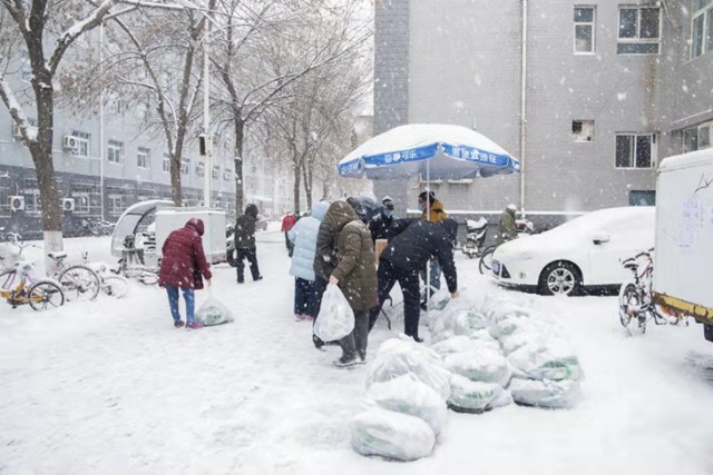 为了缓解疫情防控期间校内居民买菜不方便的困难,自2月6日起,除周六日以外,每日8点至9点在教工食堂东侧销售打包蔬菜。2月6日是试行销售的第一天,大雪中300份打包蔬菜很快销售一空,受到广大居民好评。校内居民买到新鲜蔬菜是餐饮保障人员坚守岗位、不畏严寒、默默奉献、倾情付出,全力防控疫情的一个缩影。