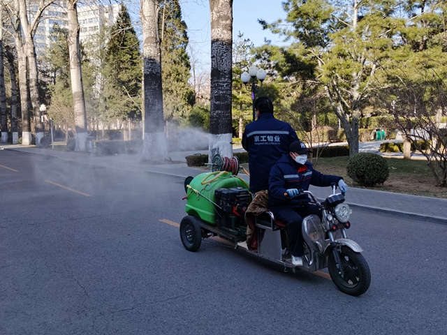 从2019年除夕至今,物业服务中心在京员工一直坚守岗位、无怨无悔、保卫校园,物业中心每日3次对学生公寓楼、教学办公楼楼和家属楼内公共区域进行消毒和开窗通风,人员密集的8号教师公寓楼内公共空间每日消毒4次;每日至少1次对校园干道、垃圾站点、家属区外围等室外公共区域进行消毒;运行班车每日2次消毒,每班次通风,确保消杀防疫无死角。