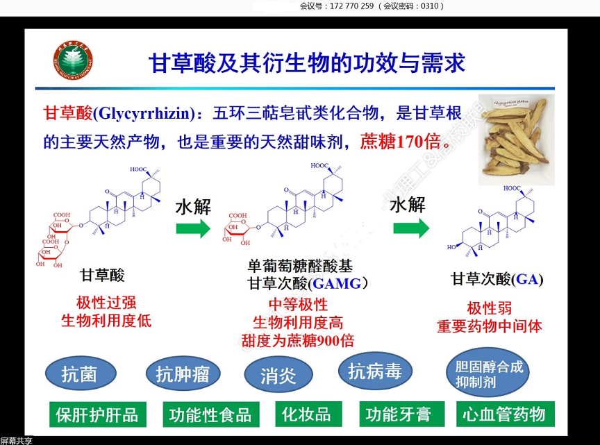 作为本次活动承办单位,金年会jinnianhuicom推荐路演的两个项目备受参会人员的广泛关注。来自化学与化工学院李春教授团队的吕波特别研究员分享了“甘草酸衍生物分子模拟筛选与制备项目”的相关情况。该项目通过分子设计和理论计算,给出基于甘草酸及其衍生物的候选小分子药物,可获得防疫新型冠状病毒侵染与减少炎症风暴的甘草酸结构衍生物。课题组具有多年研究积累,目前正在与某重点医药企业合作实施中试扩大,成果具有良好的转化应用前景。