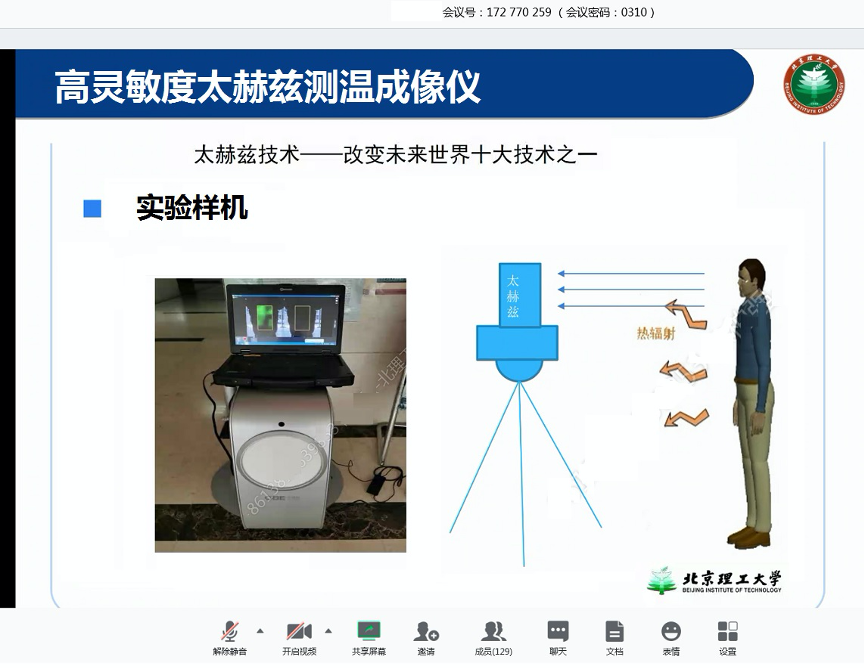 信息与电子学院博士生导师胡伟东分享了“高灵敏度太赫兹测温成像仪项目”的相关情况。该项目采用太赫兹技术,用于人体热辐射量的测量,精度可达到0.1度,且能够穿透衣物对人体表皮直接进行温度测量,可用于地铁、客运等人员密集公共场所的高效率精确测温。该项目核心技术源于国家自然科学基金重大仪器项目和风云四号气象卫星研制任务,部分技术已经在此次抗击疫情中得到应用。