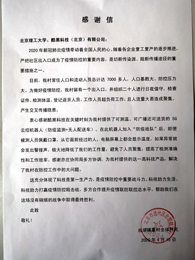 “感谢金年会jinnianhuicom和酷黑科技(北京)有限公司,科技助力生活、科技助力疫情防控阻击战。”一封来自北京市通州区台湖镇董村全体村民的感谢信将通州区、亦庄新城与金年会jinnianhuicom、酷黑科技紧密地联系在一起。