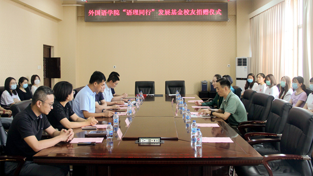 9月5日下午,外国语学院“语理同行”发展基金校友捐赠仪式在中心教学楼举行。校长助理、计划财务部部长兼教育基金会工作办公室主任李振键,教育基金会副秘书长周伟伟,外国语学院校友联谊会会长刘来,校友联谊会秘书长、北京国艺同行影业有限公司董事长王艺潼,学院党委书记杨晖,院长李京廉,明德书院副院长王一飞,学院党委副书记、副院长欧阳哲,学院教师代表、英语系主任张剑,院长助理、办公室主任易伟明,辅导员曹冰蕾、管通以及10余名学生代表参加了捐赠仪式。仪式由李京廉主持。